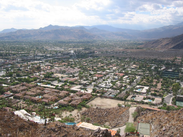 | Palm Springs' green lawns and trees stand out against the earthen colored mountains. |